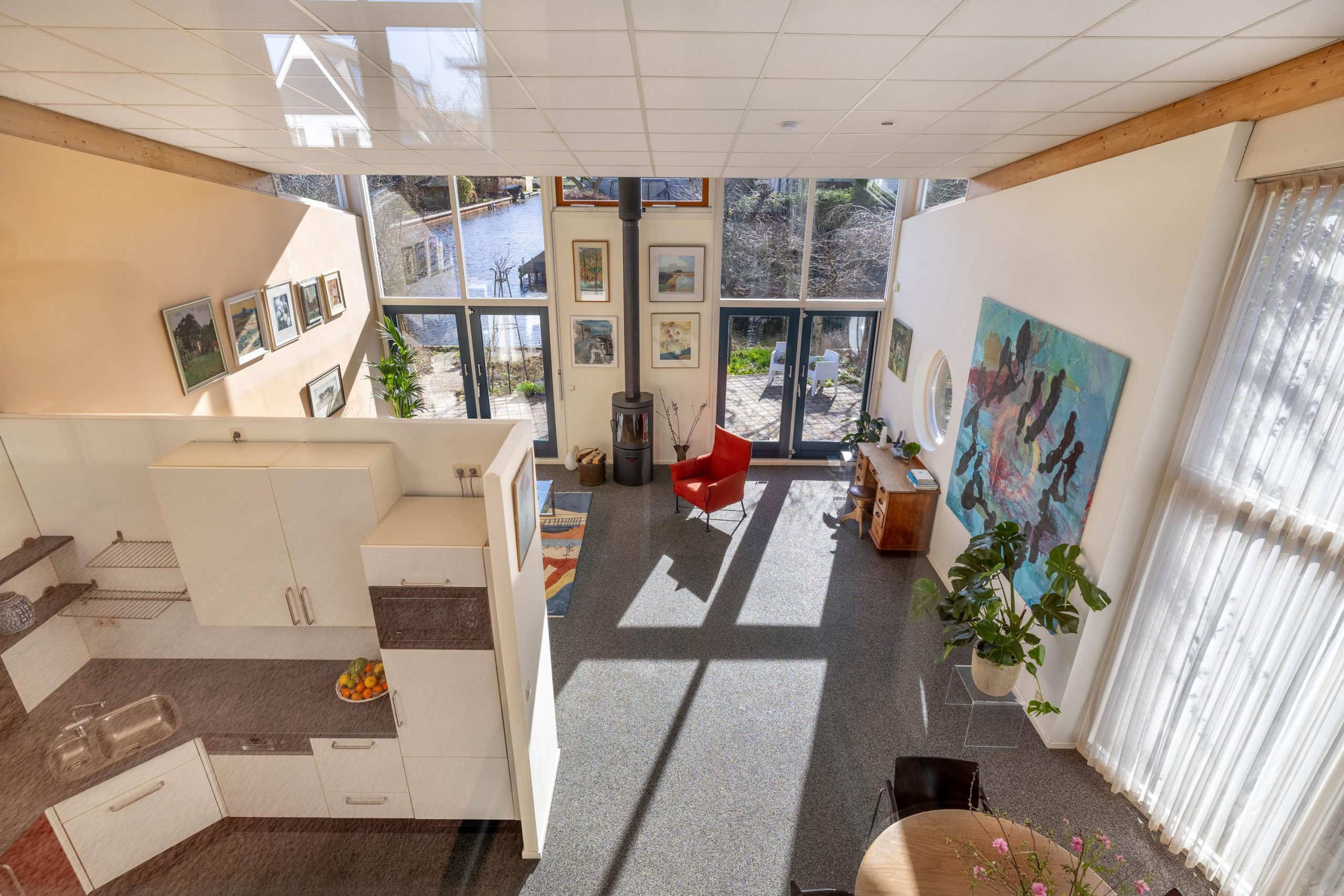 De woonkamer vormt het hart van het huis. Hier spelen licht en uitzicht de hoofdrol. Grote raampartijen zorgen voor een prachtig zicht op de tuin en het water, terwijl de zon gedurende de dag op verschillende manieren naar binnen valt. De houtkachel zorgt voor extra sfeer en warmte op koelere dagen. Dankzij de dubbele openslaande deuren loopt binnen hier moeiteloos over in buiten.